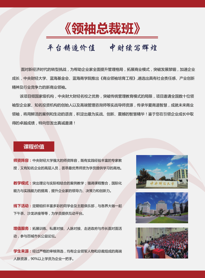 (模塊九) 中國(guó)文化根基 | 1.中國(guó)文化與強(qiáng)國(guó)之夢(mèng) 2.易經(jīng)與決策思想 3.儒家的基本精神:修身與治世 4.《金剛經(jīng)》與處事哲學(xué)智慧 5.道家的基本精神與《道德經(jīng)》精讀 6.《 黃帝內(nèi)經(jīng)》與養(yǎng)生智慧 | (模塊十) 增值課程 | 1.企業(yè)家導(dǎo)師實(shí)踐課+論壇 2.同學(xué)會(huì)&主題俱樂(lè)部 3.走進(jìn)企業(yè)參訪游學(xué) 4.走進(jìn)城市政府與市長(zhǎng)對(duì)話+班級(jí)年會(huì)+百城市長(zhǎng)公益論壇 |